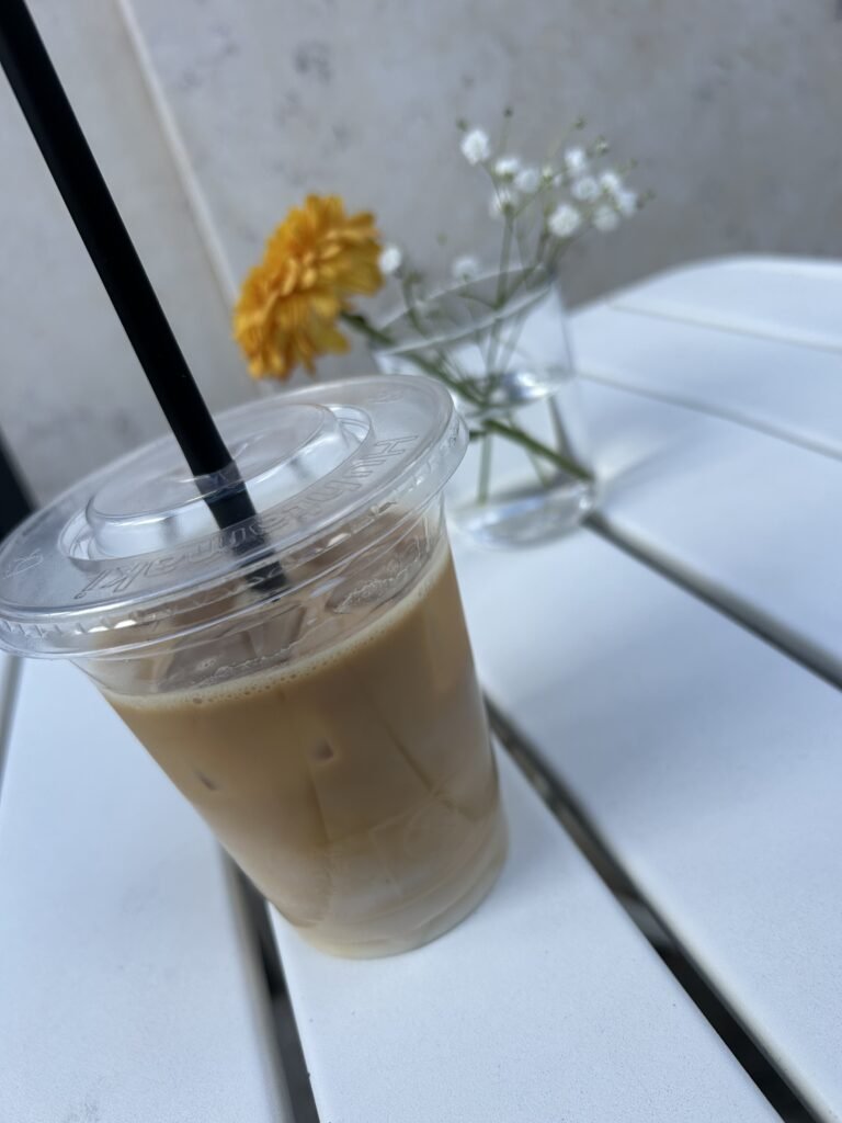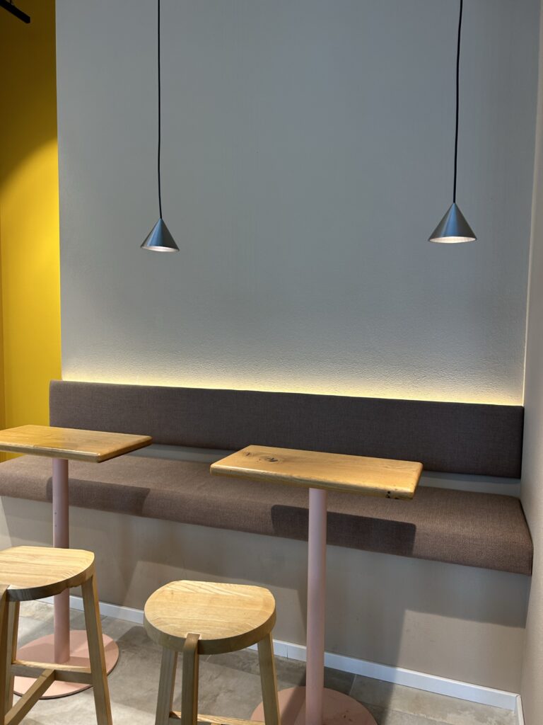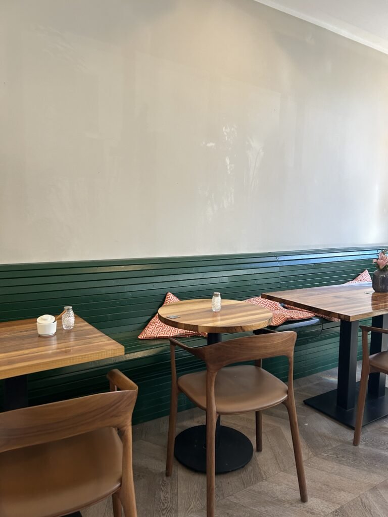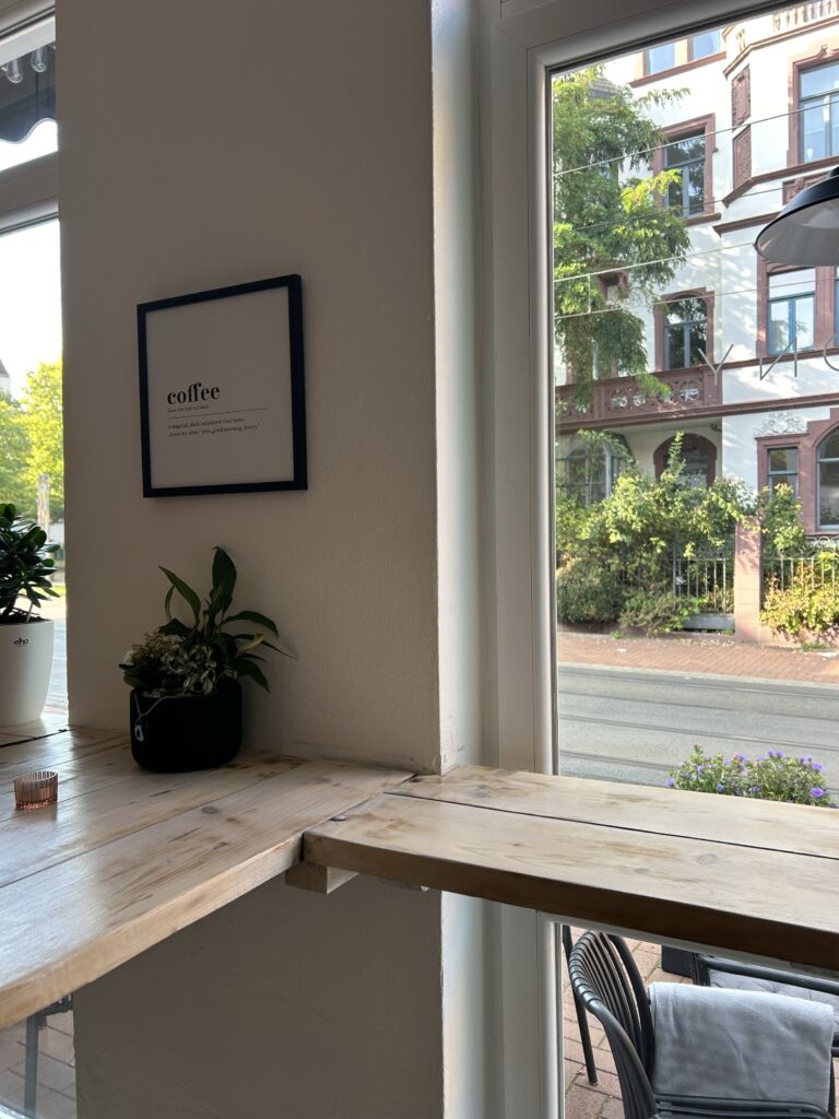 Die Atmosphäre lädt zum Verweilen ein, da es minimalistisch, aber auch schick und modern eingerichtet ist. Es gibt Plätze mit direktem Blick aus dem Fenster zur Straße, sodass man das Geschehen draußen beobachten kann.